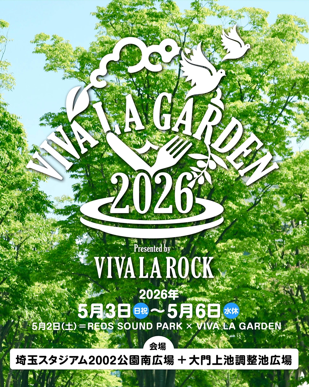 VIVA LA ROCK 2026の開催日について、5月3日(日祝)・4日(月祝)・5日(火祝)・6日(水休)の4日間で決定しました!