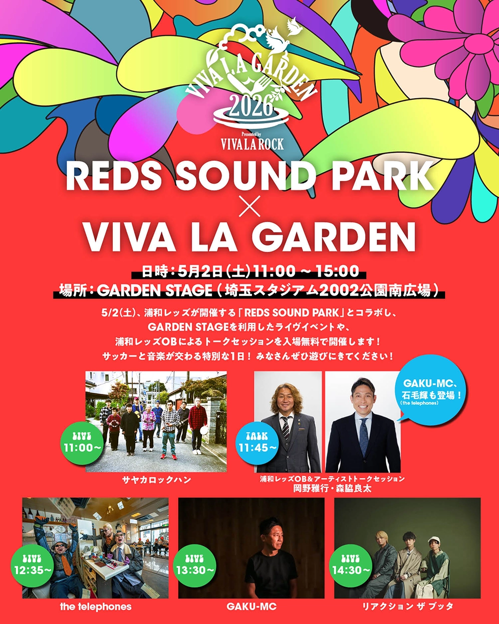 VIVA LA ROCKの開催前日にして、浦和レッズのホームゲーム当日である5月2日(土)、埼玉スタジアム2002公園南広場にて、浦和レッズが開催する「REDS SOUND PARK」とのコラボイベントが決定しました!